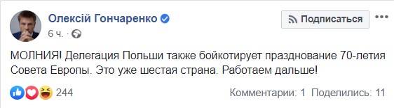 "Делегация Польши также бойкотирует празднование 70-летия Совета Европы. Это уже шестая страна. Работаем дальше", - написал Гончаренко.