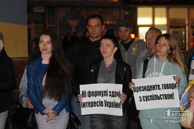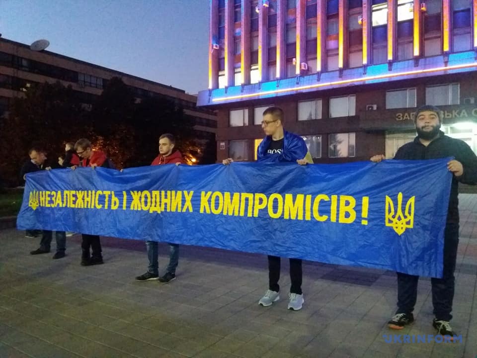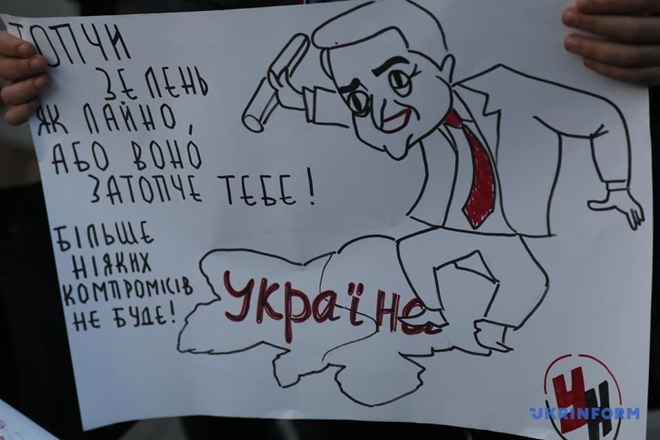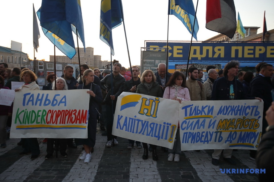 Националисты держали плакаты с лозунгами "Нет - отводу войск!", "За что умирали наши люди?", "Капитуляция не пройдет!", "Формуле Штайнмайера - нет!", "Сегодня - Донбасс, завтра - Украина" и другие.