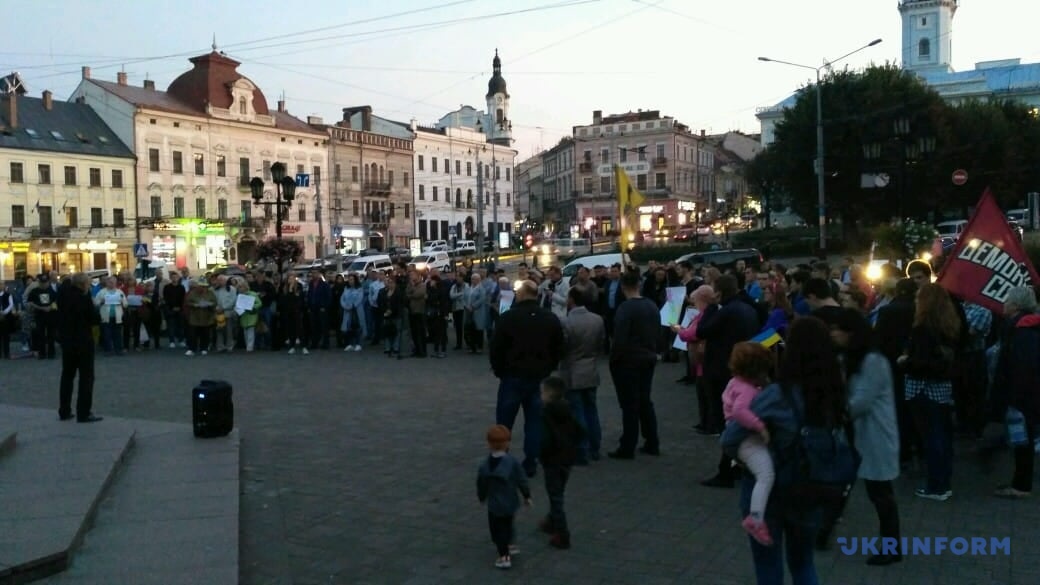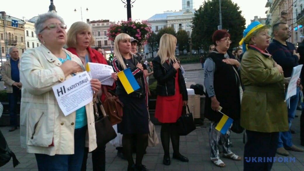 В центре Черновцов протестующие держали в руках флаги Украины и плакаты, в которых требуют от руководства государства отказаться от формулы Штайнмайера.