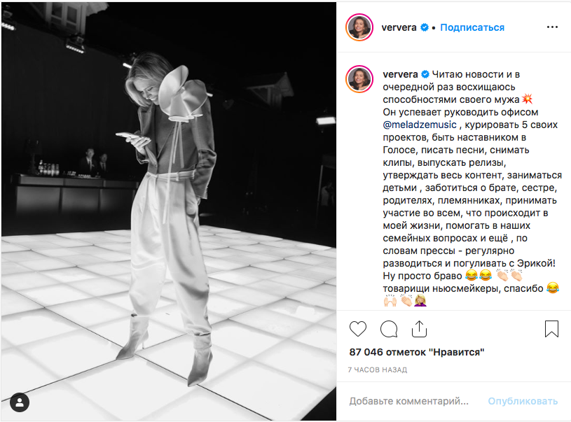 "Он успевает руководить офисом MeladzеMusic, курировать пять своих проектов, быть наставником в "Голосе", писать песни, снимать клипы, выпускать релизы, утверждать весь контент, заниматься детьми, заботиться о брате, сестре, родителях, племянниках, принимать участие во всем, что происходит в моей жизни, помогать в наших семейных вопросах и еще, по словам прессы, регулярно разводиться и погуливать с Эрикой!" - написала Вера Брежнева и прикрепила к сообщению свое черно-белое фото, на котором она в оригинальной блузе с улыбкой смотрит в смартфон.