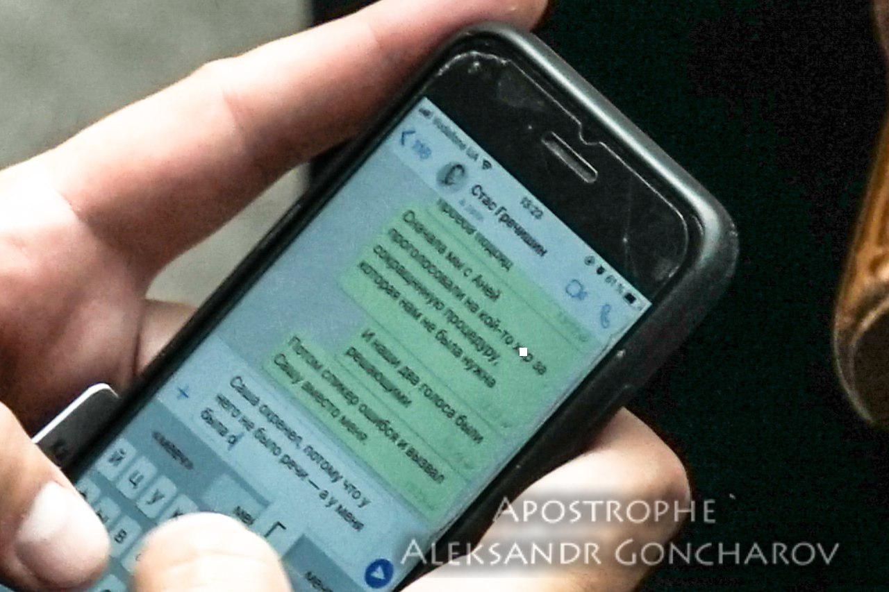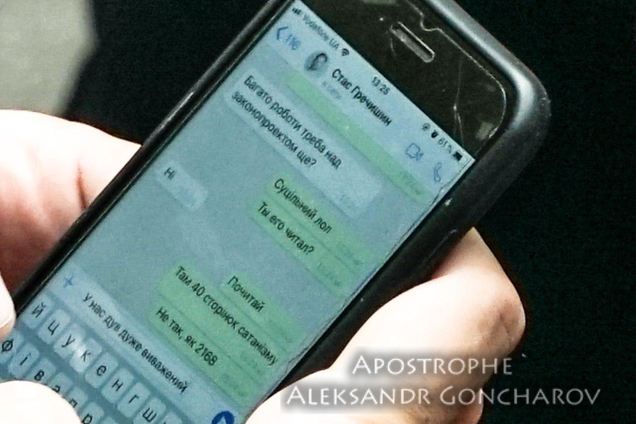 Как сообщается, во время голосования народный депутат Дмитрий Гурин вел переписку со Станиславом Гречишиным об Александре Ткаченко - авторе законопроекта. Все они из фракции "Слуга народа". Корреспондент издания запечатлел на фото данную переписку.
