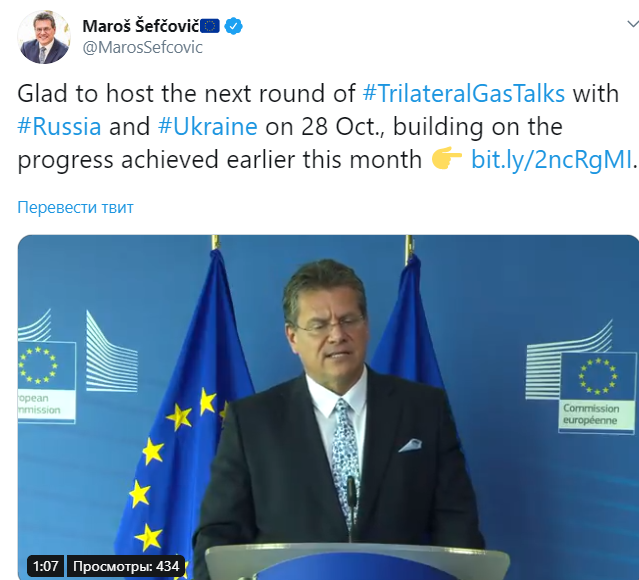 Трехсторонние газовые переговоры между Еврокомиссией, Украиной и Россией запланированы на 28 октября. Об этом заявил вице-президент ЕК Марош Шефчович в своем микроблоге в Twitter.