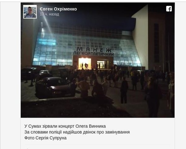 Но акция протеста не была массовой, поклонники Винника спокойно проходили в зал. Концерт начался вовремя. Однако буквально через минут 20 выступление пришлось прервать из-за поступившего в полицию сообщения об угрозе взрыва в здании, где проходил концерт.
