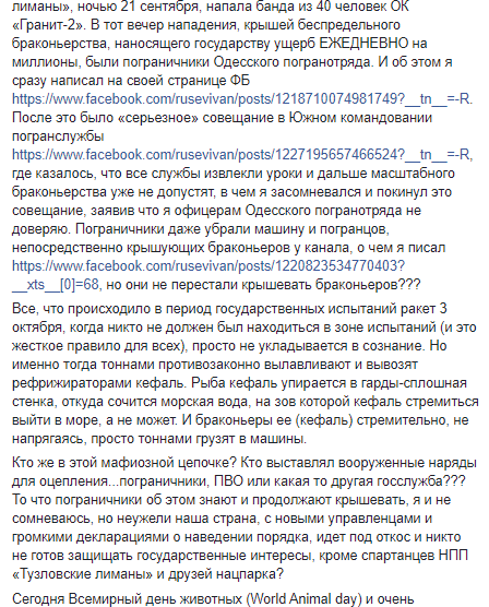 "Средь бела дня, рефрижераторы вывозят контрабандным путем десятки тонн кефали из НПП "Тузловские лиманы", в строго контролируемой погранзоне и тогда, когда в разгаре, на уровне держава Украина, проходят испытания ракетных комплексов Ольха-М и Нептун в Одесской области на государственном испытательном полигоне "Алибей" в Татарбунарском районе (!)" - добавляет эколог.