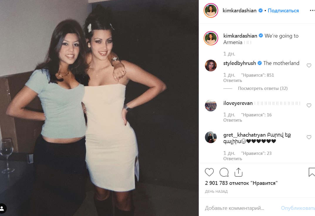 Вчера Ким выкладывала в соцсети свою архивную фотографию, на которой она позирует вместе с Кортни. Снимок она подписала: "Время ехать в Армению".
