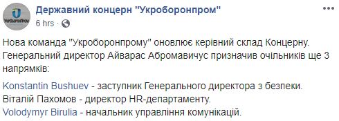 "Новая команда Укроборонпрома обновляет руководящий состав концерна. Генеральный директор Абромавичюс назначил руководителей еще 3 направлений: Константин Бушуев - заместитель генерального директора по безопасности. Виталий Пахомов - директор HR-департамента. Владимир Бируля - начальник управления коммуникаций", - говорится в сообщении.