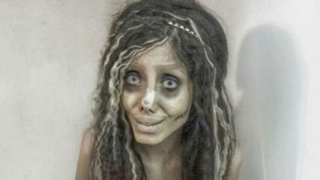Сахар Nабар прославилась в Instagram своими фото, на которых она похожа на голливудскую актрису Анджелину Джоли, но в довольно жутком образе. Гипертрофированные черты лица девушки на фото похожи не то на куклу, не то на зомби.
