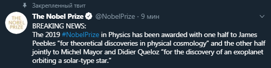 Половину премии присудили Джеймсу Пиблсу "за теоретические исследования в космологии", вторую - Мишелю Майору и Дидье Кело "за открытие экзопланеты на орбите солнцеподобной звезды".