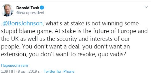 В то же время, в Европе выразили обеспокоенность позицией Великобритании. "На карту поставлено будущее Европы и Великобритании, а также безопасность и интересы наших людей. Вы не хотите сделки, вы не хотите продления, вы не хотите отмены, quo vadis?" - написал председатель Евросовета Дональд Туск в своем Twitter. По его словам, речь "не о победе в некой игре".