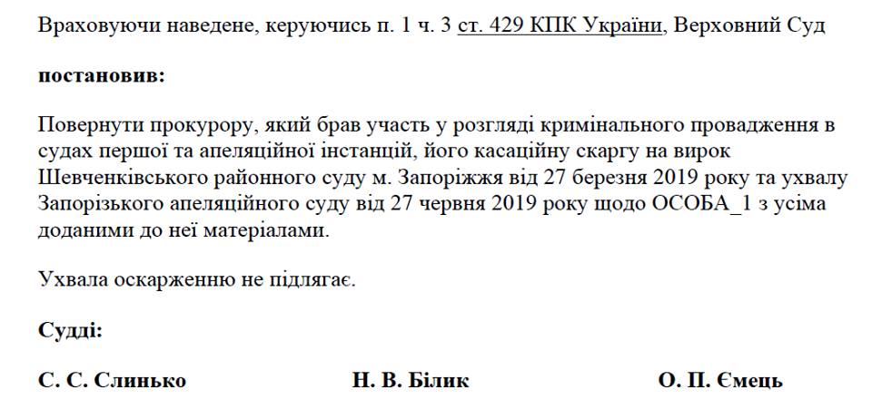 Согласно выложенному скриншоту постановления Верховного суда, по данному делу суд постановил "вернуть прокурору... его кассационную жалобу на решение Шевченковского районного суда г. Запорожья  от 27 марта 2019 года и постановление Запорожского апелляционного суда от 27 июня 2019 года".