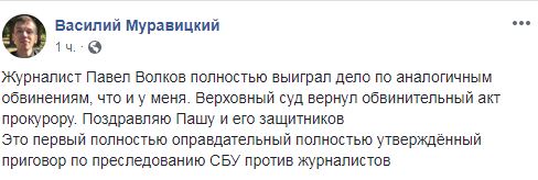"Журналист Павел Волков полностью выиграл дело по аналогичным обвинениям, что и у меня. Верховный суд вернул обвинительный акт прокурору. Поздравляю Пашу и его защитников", - написал Муравицкий. По его данным, "это первый полностью оправдательный полностью утвержденный приговор по преследованию СБУ против журналистов".
