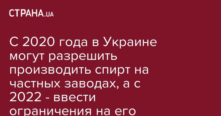 Министерство развития экономики, торговли и сельского хозяйства Украины проводит реформу спиртовой отрасли, которая предполагает ее демонополизацию. Спирт с 1 января 2020 года смогут производить и частные заводы, а с 2022 года будут введены ограничения на его импорт. Также предусмотрены введение лицензирования производства и оптовой торговли спиртом, контроля за производством со стороны государства.