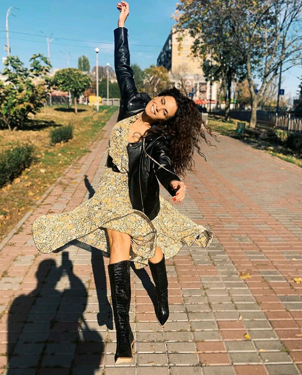 На одном снимке смеющаяся Настя прыгает навстречу фотографу (предположительно мужу Потапу, судя по его тени на тротуаре). Она одета в пестрое летнее платье, кожаную куртку и высокие сапоги.