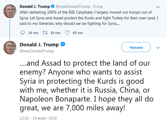 "После 100% победы над халифатом ИГИЛ я вывел наши войска из Сирии. Пусть Сирия и Асад защищают курдов и сражаются с Турцией за свою землю. Я сказал своим генералам, почему мы должны воевать за Сирию... А Асад защищал свою землю от нашего врага? Любой, кто хочет помочь Сирии в защите курдов, согласится со мной, будь то Россия, Китай или Наполеон Бонапарт. Я надеюсь, что все они отлично справляются, ведь мы в 7000 милях оттуда", - написал Дональд Трамп.