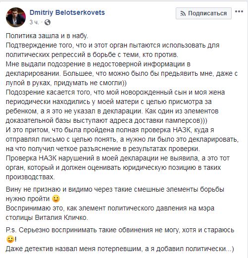 "Подозрение касается того, что мой новорожденный сын и моя жена периодически находились у моей матери с целью присмотра за ребенком, а я это не указал в декларации. Как один из элементов доказательной базы выступают адреса доставки памперсов", - пояснил Белоцерковец.