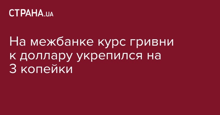 Курс гривни на межбанковском валютном рынке в среду укрепился почти на 3 копейки до 24,760 грн/$1 с 24,785 грн/$1 в предыдущий рабочий день. Об этом сообщили агентству Интерфакс-Украина дилеры коммерческих банков.
