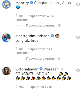 Пару с важным событием уже поздравляют представители футбольного бомонда. Не осталась в стороне и официальная страница "Манчестер Сити", прокомментировав снимок так: "Поздравления, Алекс". Молодоженов также поздравил экс-игрок футбольной команды Фабиан Делф: "Да, мой маленький брат, мои поздравления". Украинский футболист сербского происхождения Марко Девич написал "Браво!".