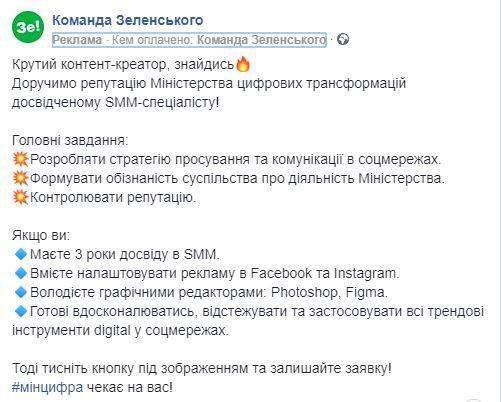 Команда Владимира Зеленского ищет SMM-специалиста для продвижения страниц Министерства цифровых трансформаций в социальных сетях. Об этом свидетельствует пост, размещенный в Facebook.