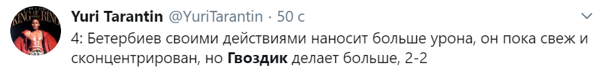 Во втором раунде сперва пропустил удар Бетербиев от Гвоздика, а затем уже Гвоздик от Бетербиева. Своеобразный обмен на ринге. Встреча на ринге относительно равная.