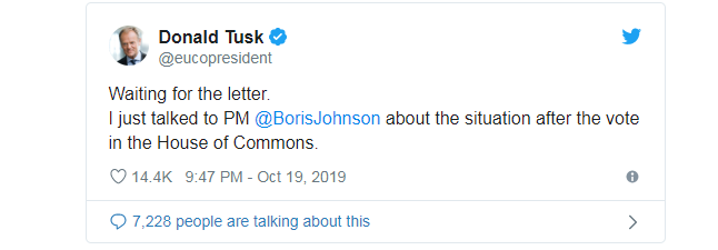 Премьер-министр Великобритании Борис Джонсон поговорил с главой Евросовета Дональдом Туском, что до конца субботы, 19 октября, направит ему письмо с просьбой вновь перенести срок Brexit, сообщает Sky News со ссылкой на официальное лицо в ЕС.