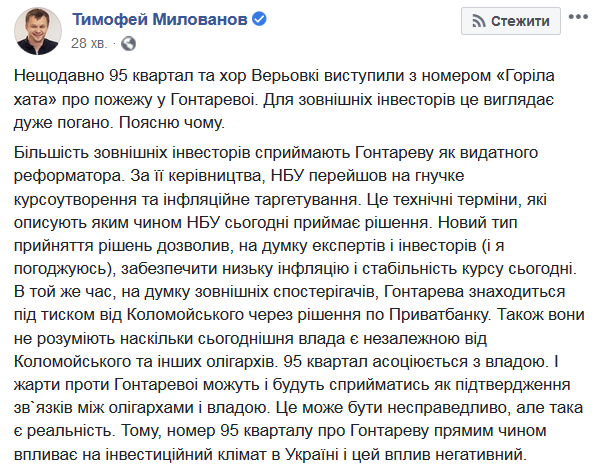 "Гонтарева находится под давлением от Коломойского за решения по Приватбанку. Также они не понимают насколько сегодняшняя власть является независимой от Коломойского и других олигархов. "95 квартал" ассоциируется с властью. И шутки против Гонтаревой могут и будут восприниматься как подтверждение связей между олигархами и властью. Это может быть несправедливо, но такова реальность. Поэтому, номер "95 квартала" о Гонтаревой прямым образом влияет на инвестиционный климат в Украине и это влияние отрицательное", - написал Тимофей Милованов.