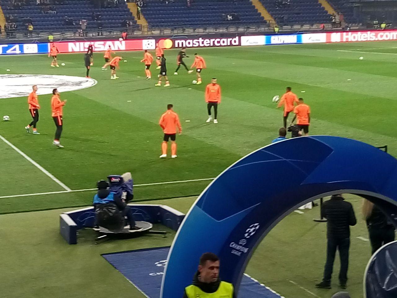 19:19 На стадионе активно разминаются игроки гостей. Большинство же игроков Шахтера пока в подтрибунном помещении.