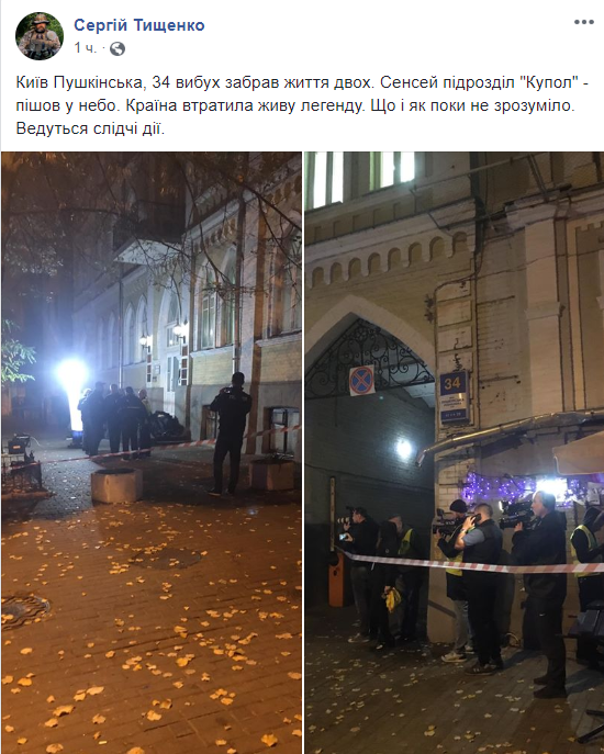 "Киев Пушинская, 34 взрыв забрал жизнь двоих. Сенсей из подразделения "Купол" ушел на небеса. Страна потеряла живую легенду. Что и как пока не понятно. Ведутся следственные действия", пишет у себя в Facebook журналист Сергей Тищенко с позывным Дровосек.