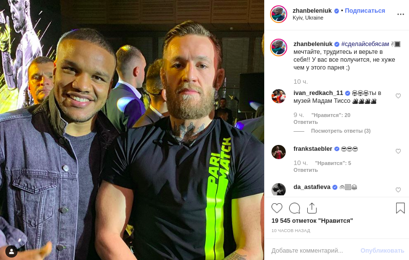 С Макгрегором в Киеве сфотографировался чемпион мира по греко-римской борьбе, народный депутат Жан Беленюк. Общее фото он разместил в Instagram.