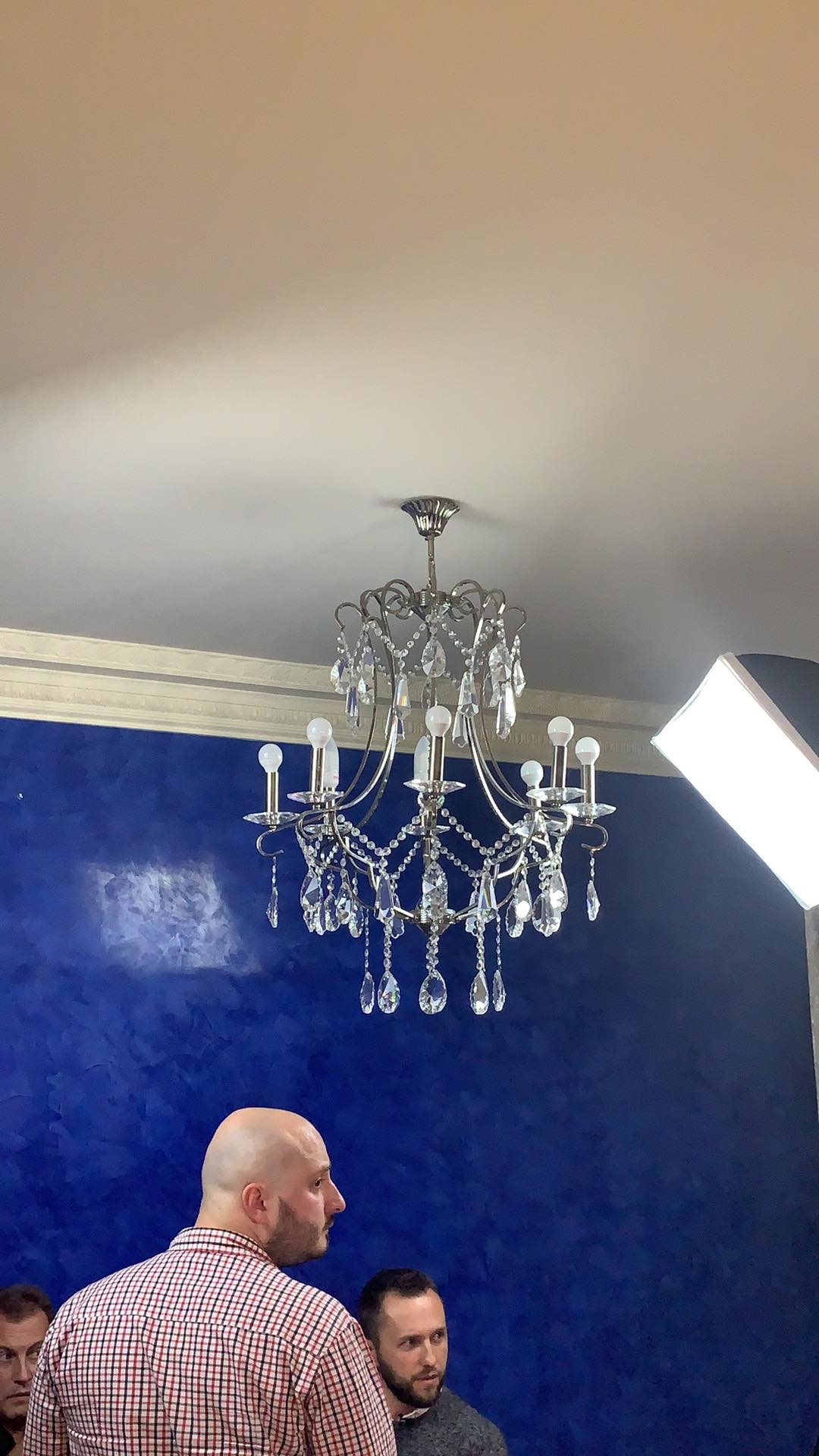 Интерьер в квартире впечатляет, говорят, раньше ее арендовал посол Китая в Украине. Само исследование проходит на фоне синей глянцевой стены и под огромной люстрой.