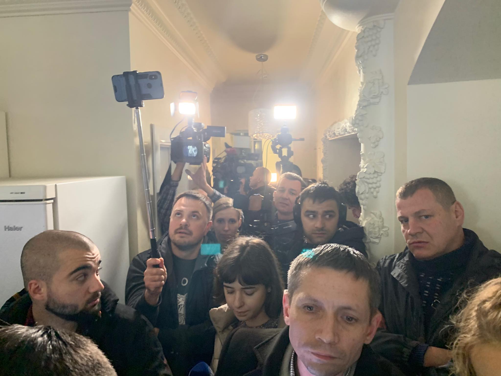 В квартире находится очень много людей, все они едва помещаются. Депутат Александр Дубинский, который после обвинений во взяточничестве решил пройти тест на детекторе лжи в прямом эфире, пригласил на "полиграф-шоу" журналистов. Во время прохождения полиграфа в помещении оставят только операторов, чтобы сохранить тишину.