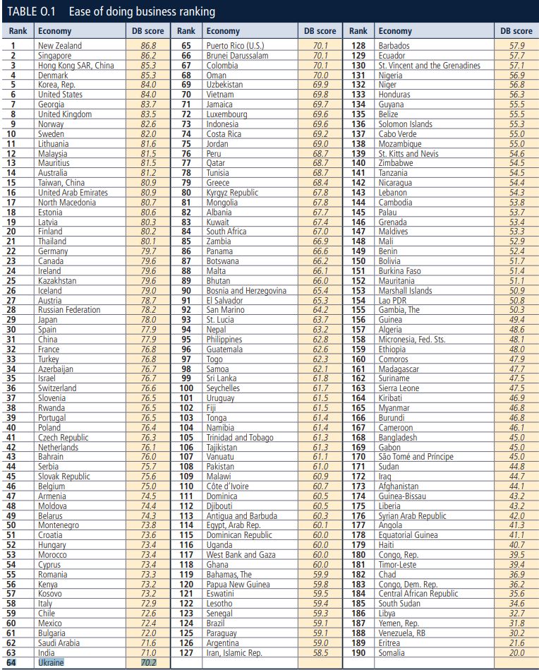 Всемирный банк опубликовал ежегодный рейтинг инвестиционной привлекательности стран мира Doing Business, в котором Украина поднялась сразу на 7 пунктов по сравнению с прошлогодним рейтингом. Она заняла заняла 64-е место среди 190 стран.