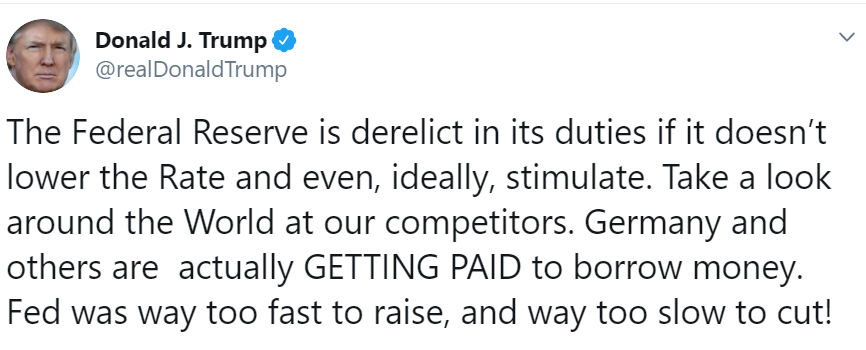 "Федрезерв уклонится от исполнения своих обязанностей, если не снизит ставку и, в идеале, не введет стимулирующие меры", - говорится в твиттер-микроблоге Трампа.
