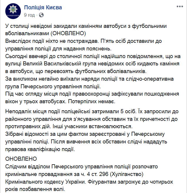 "В полицию поступило сообщение, что на улице Большой Васильковской группа неизвестных лиц бросает камни в автобусы, перевозящие футбольных болельщиков. По вызову немедленно выехали наряды полиции и следственно-оперативная группа Печерского управления полиции. При осмотре места происшествия правоохранители зафиксировали повреждения окон в трех автобусах. Пострадавших нет", - уточнили в полиции.