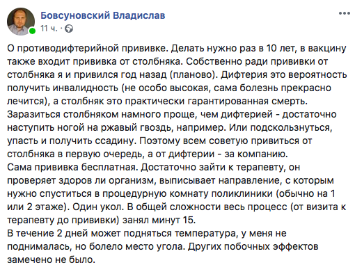 Журналист Владислав Бовсуновский уверен: прививаться от дифтерии нужно каждые 10 лет. Он отмечает, что делает так сам и всем советует.