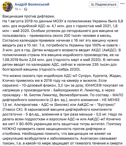 "На 1 августа 2019 по данным МОЗУ в поликлиниках Украины было 5,9 млн. доз индийской АДС-м. 4,1 млн. доз с годностью май 2021, 1,8 млн - май 2020. Особым успехом до сегодняшнего дня вакцина не пользовалась - прививалось около 200 тысяч человек в месяц. Согласно календаря прививок начиная с 16 лет эту вакцину нужно вводить раз в 10 лет. Т.е. потребность Украины при 100%-м охвате - 3 млн. доз в год. Детям младшего возраста вводят АКДС (АаКДС). В поликлиниках страны эта вакцина индийского производства, ее на 1.08.2019 было 2,04 млн. доз (годность март и май 2020). 6-летним детям вводят по календарю АДС, сейчас в наличии 235 тысяч доз болгарской вакцины (годность ноябрь 2020).