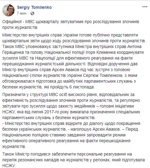 Министерство внутренних дел Украины готово публично представлять ежеквартальные отчеты о ходе расследования преступлений против журналистов. Соответствующее поручение дал министр внутренних дел Арсен Аваков во время встречи с председателем Национального союза журналистов Украины (НСЖУ) Сергеем Томиленко, с которым обсуждалась подготовка к предстоящим парламентским слушаниям по безопасности журналистов, которые пройдут 6 ноября. Об этом Сергей Томиленко рассказал в Facebook.