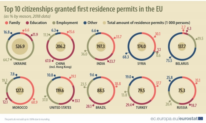 По данным статистического ведомства ЕС, в 2018 году граждане Украины получили 527 тыс. видов на жительство, из которых 78% в Польше, и снова заняли первое место.
