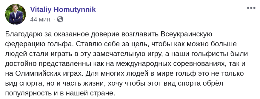 "Благодарю за оказанное доверие возглавить Всеукраинскую федерацию гольфа. Ставлю себе за цель, чтобы как можно больше людей стали играть в эту замечательную игру, а наши гольфисты были достойно представленны как на международных соревнованиях, так и на Олимпийских играх. Для многих людей в мире гольф это не только вид спорта, но и часть жизни, хочу чтобы этот вид спорта обрёл популярность и в нашей стране" - написал Хомутынник.
