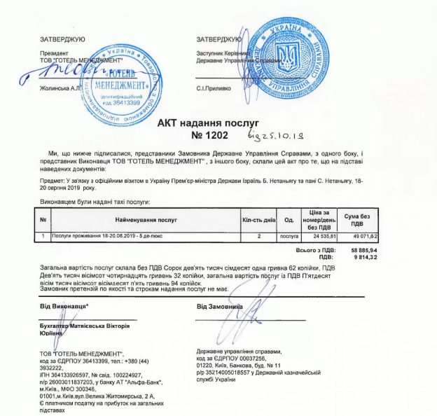 Кроме того, в связи с официальным визитом Нетаньяху с 18 по 20 августа ГУД снимало в этом отеле 5 номеров де-люкс общей стоимостью 58,9 тыс. гривен за две ночи.