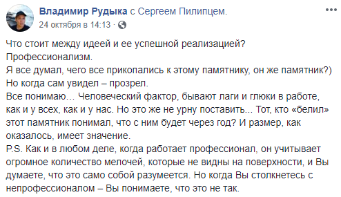 "Что стоит между идеей и ее успешной реализацией? Профессионализм. Я все думал, чего все прикопались к этому памятнику, он же памятник? Но когда сам увидел – прозрел. Все понимаю… Человеческий фактор, бывают лаги и глюки в работе, как и у всех, как и у нас. Но это же не урну поставить... Тот, кто "белил" этот памятник понимал, что с ним будет через год? И размер, как оказалось, имеет значение", - отметил Владимир Рудыка.