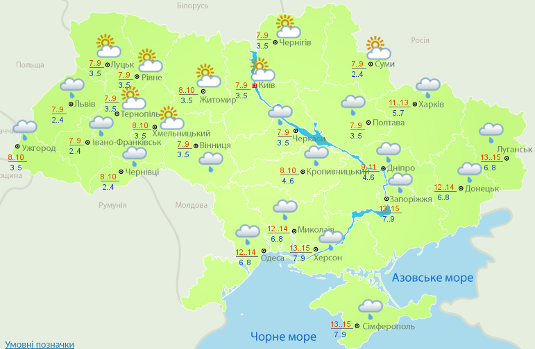 Во всех регионах, кроме Луцка, Ровно, Тернополя, Хмельницкого, Винницы, Житомира, Киева и Чернигова ожидается дождь.