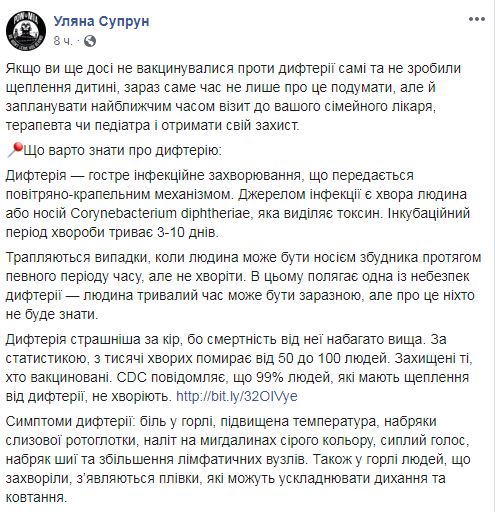 Экс-и.о.министра здравоохранения Украины Ульяна Супрун рассказала, что вакцинироваться против дифтерии должны взрослые и дети. Об этом она написала на своей странице в Facebook, отметив, что прививку можно сделать, запланировав визит к семейному врачу, терапевту или педиатру.
