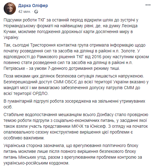 "Трехстороннюю контактную группу, которая сейчас работает в Минске, проинформировали, что сегодня стороны начали разведение сил и средств на участке в районе н.п. Золотое. В подтверждение этого с обеих сторон были запущены сигнальные ракеты", - написала в Facebook пресс-секретарь экс-президента Дарка Олифер.