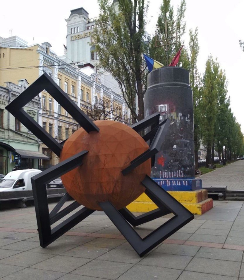 В Киеве на месте синей руки и ледяной рыси появился ржавый шар. Фото