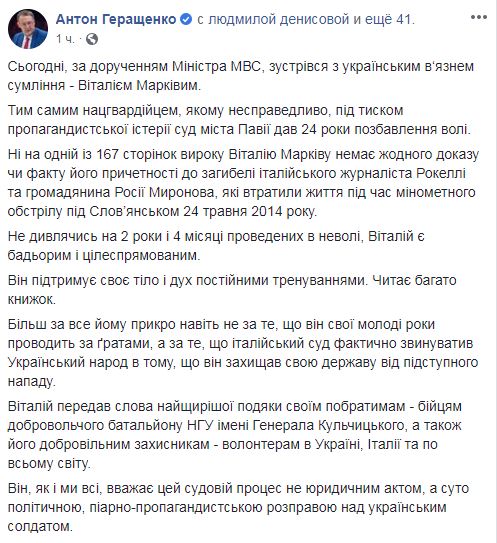 "Сегодня, по поручению Министра МВД, встретился с украинским узником совести - Виталием Маркивым. Тем самым нацгвардейцем, которому несправедливо, под давлением пропагандистской истерии суд Павии дал 24 года лишения свободы", - написал Геращенко.