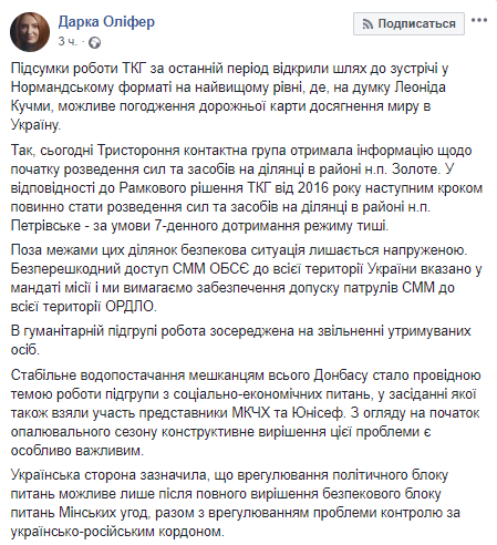 Трехсторонняя контактная группа (ТКГ) считает, что сообщение о разведении сил в Золотом позволит провести встречу в нормандском формате на высшем уровне.