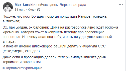 Даже если и провокацию делали, теперь амплуа клиента дома терпимости закрепится" – написал журналист Макс Сорокин.