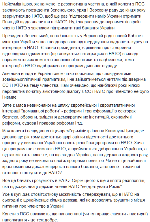 Самой сомнительной, как по мне, есть резолютивная часть, в которой коллеги из ПЕС призывают президента Зеленского, правительство и Раду до конца года обратиться в НАТО, чтобы еще раз "подтвердить намерение Украины получить План действий по членству в НАТО". Ну, и обращение к парламентам стран-членов НАТО с призывом поддержать такие желания Украины.