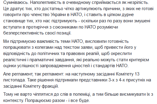 "Вчера в очередной раз возникла полемика с коллегами из фракции ПЕС вокруг наспех внесенного ими на рассмотрение Комитета внешней политики проекта заявления Верховной Рады относительно НАТО.