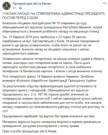 Прокуратура направила в суд обвинительный акт в отношении гражданина Республики Армения. Его обвиняют по ч. 2 ст. 187 УК Украины (разбой, совершенный по предварительному сговору группой лиц с целью завладения чужим имуществом, соединенное с насилием опасным для жизни человека, подвергшегося нападению).